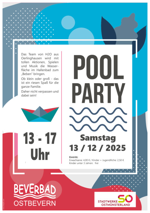 Bevor sich das Jahr dem Ende entgegen neigt, gibt es im BEVERBAD noch einmal richtig Partystimmung. Am Samstag, 13. Dezember 2025, verwandelt nämlich das H2O-fun Event-Team aus Oerlinghausen das Hallenbad von 13 – 17 Uhr in eine bunte Spiel- und Tobewelt für Kinder und Jugendliche: Bei einer großen Poolparty dürfen sich die jungen Badegäste auf ein abwechslungsreiches Programm voller Action, Spaß und guter Laune freuen.