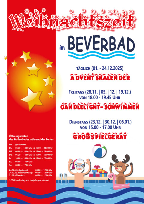 Zum 1. Januar 2026 ändern sich die Eintrittstarife. Erwachsene zahlen zukünftig 4,50 € und Kinder bzw. Jugendliche 3,00 € für einen einmaligen Badespaß. Für Kinder bis zur Vollendung des 4. Lebensjahres ist der Eintritt ins BEVERBAD frei.