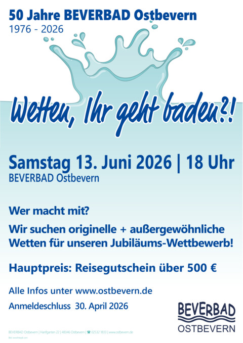 Im Rahmen seines 50-jährigen Jubiläums lädt das BEVERBAD am Samstag, 13.06.2026, zu einem ganz besonderen Wettbewerb ein. Unter dem Motto „Wetten, Ihr geht baden?!“ werden kreative, sportliche und außergewöhnliche Wetten für unsere große Spielshow im BEVERBAD gesucht.
