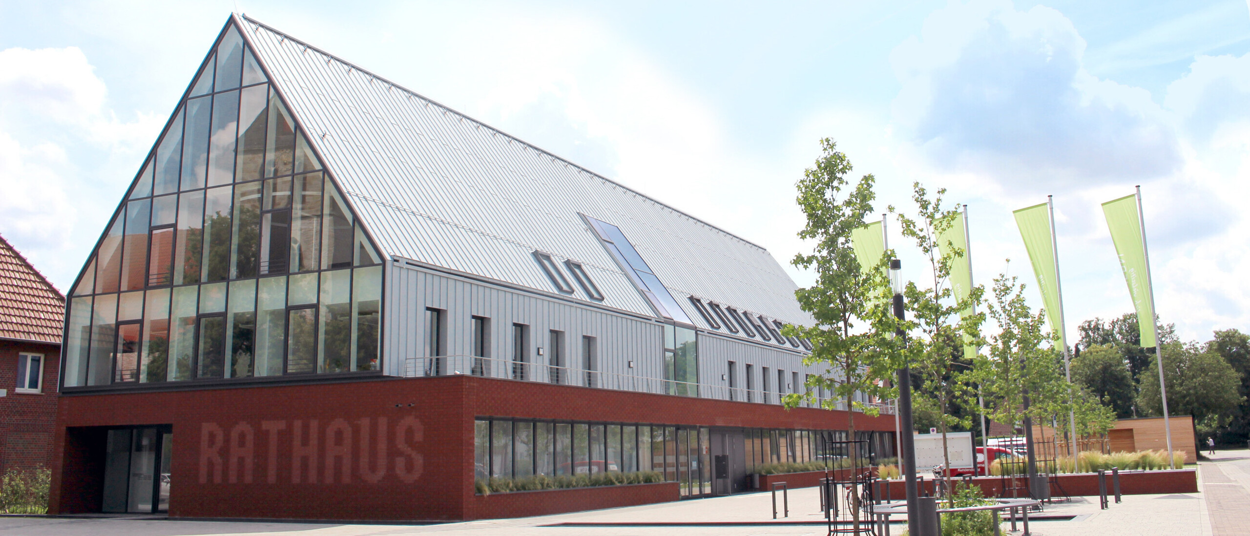 Die moderne Architektur des neuen Rathauses, für viele zunächst gewöhnungsbedürftig, prägt nun jedoch den Ortskern, denn die ungewöhnliche Optik hebt die besondere Bedeutung als öffentliches Gebäude noch einmal ausdrucksvoll hervor. Der Entwurf stammt vom Architekturbüro Schnoklake, Betz und Dömer aus Münster und interpretiert ein westfälisches Langhaus auf moderne Art und Weise neu.