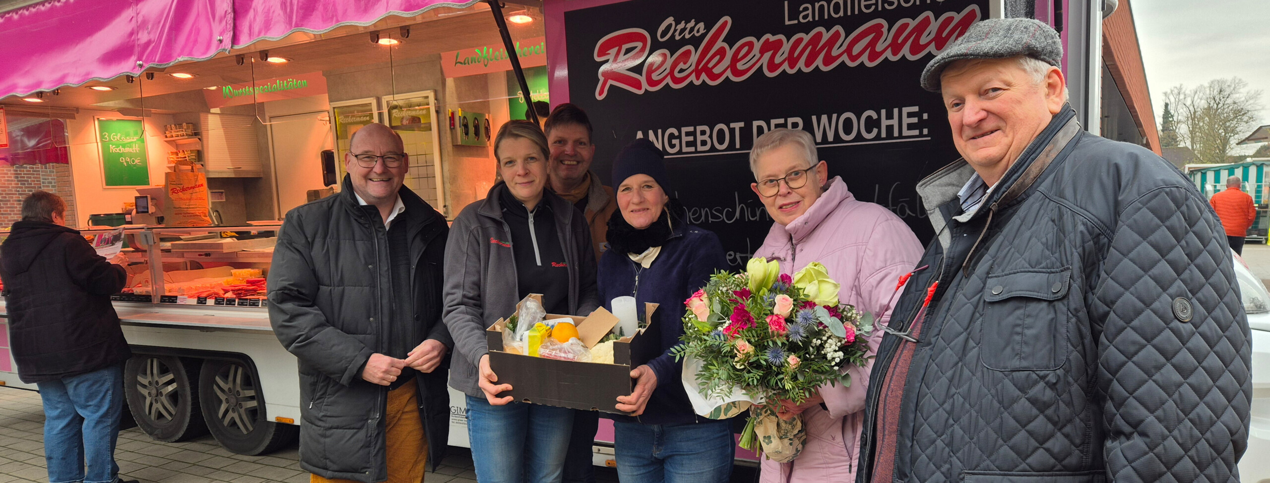 Neben Blumen aus dem Rathaus gab es für Familie Reckermann/Künne von den Wochenmarktbeschickern einen bunt gefüllten Präsentkorb mit allen Köstlichkeiten, die den Wochenmarkt ausmachen – ein Zeichen der Wertschätzung und Verbundenheit. Die Landfleischerei Reckermann genoss über all die Jahre einen hervorragenden Ruf: Die angebotenen Produkte standen für hohe Qualität und handwerkliche Tradition und machten den Stand zu einem festen und geschätzten Bestandteil des Marktes.