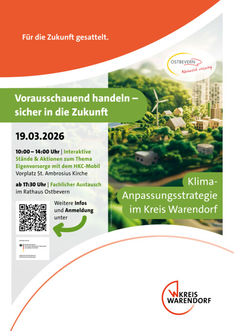 Ziel der Veranstaltung ist es, allgemein über die Klimaentwicklungen im Kreisgebiet zu informieren, kommunenspezifische Besonderheiten herauszustellen, relevante Maßnahmen vorzustellen und die Thematik anschließend in einer mit Fachakteuren besetzten Podiumsrunde zu diskutieren. Moderiert und durchgeführt wird die Veranstaltung durch das Klimaanpassungsmanagement des Kreis Warendorf, sowie durch ein beauftragtes Projektbüro. Zudem ist vorgesehen, den gemeindespezifischen Konzeptteil für Ostbevern im kommenden Umwelt- und Planungsausschuss am 14.04.2026 zu beraten.